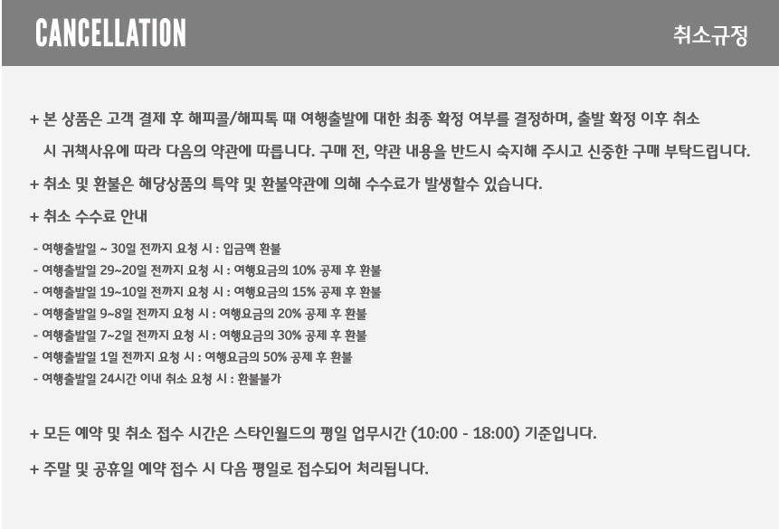 • 예약취소의 경우 요청을 주신 실제 시간과는 무관하며, 주말/공휴일을 제외한 영업일 및 영업시간(9시~18시) 기준으로 접수된 시점을 기준으로 적용됩니다.