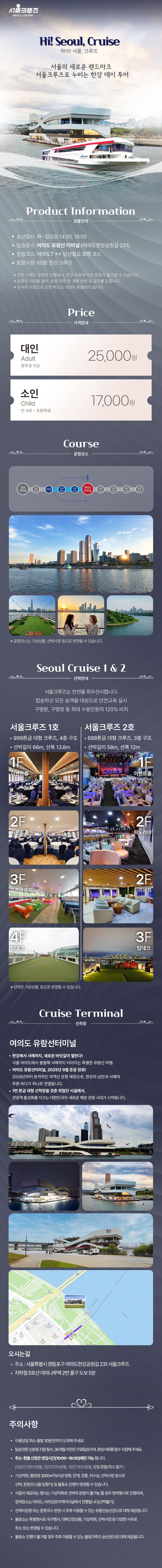한강 방류, 기상 악화, 선박 사정 등으로 한강 운항이 불가할 경우 아라뱃길 코스로 대체 운항되며, 이로 인한 환불 또는 요금 인하는 불가합니다.
