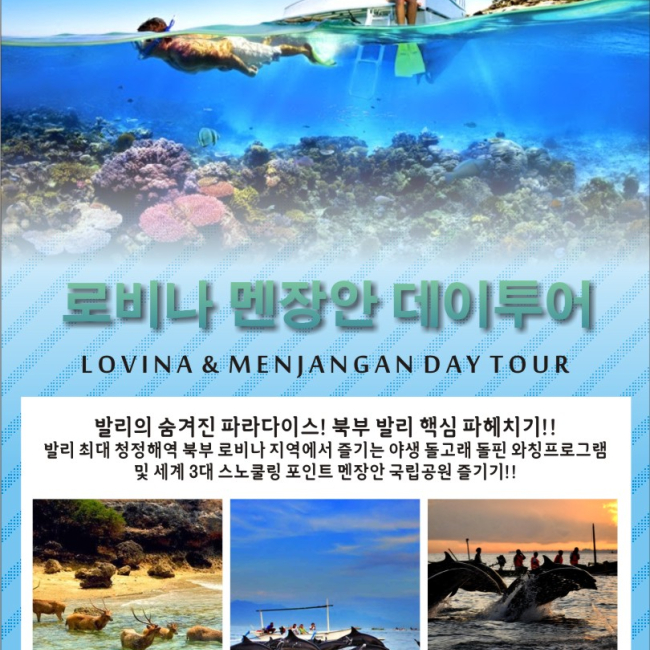 발리에는 세계 3대 스노클링 포인트로 불리는 멘장안 지역이 있는데요, 청정한 북부지역에 있어 남부와는 차원이 다르게 맑은 바다를 보실 수 있어요. 이 곳은 스노클링을 좋아하시는 분들에게는 필수인 코스이지요. 게다가 발리에서 야생돌고래 떼까지 볼 수 있다면 더욱 특별한 경험이겠죠? 로비나+멘장안 데이투어는 야생돌고래도 보고 멘장안에서 스노클링도 할 수 있는 데이투어에요. 로비나지역은 멀기 때문에 일찍 기사님과 미팅하여 이동하게 돼요. 그 다음 돌핀와칭 투어를 진행하는데, 이때 돌고래를 기다리며 바다에서 멋진 일출까지 보실 수 있어요. 전통 배인 쭈꿍을 타고 바다 위에서 보시는 평화로운 일출이 장관이니, 평생 잊지 못할 추억이 될 거에요. 돌고래를 본 후엔 멘장안으로 이동해서 스노클링을 즐기시는데, 점심식사 전 후로 한번씩 두 번 진행돼요. 아름다운 바다에서 형형색색 산호, 물고기들과 함께 스노클링하며 행복한 시간을 즐겨보세요.