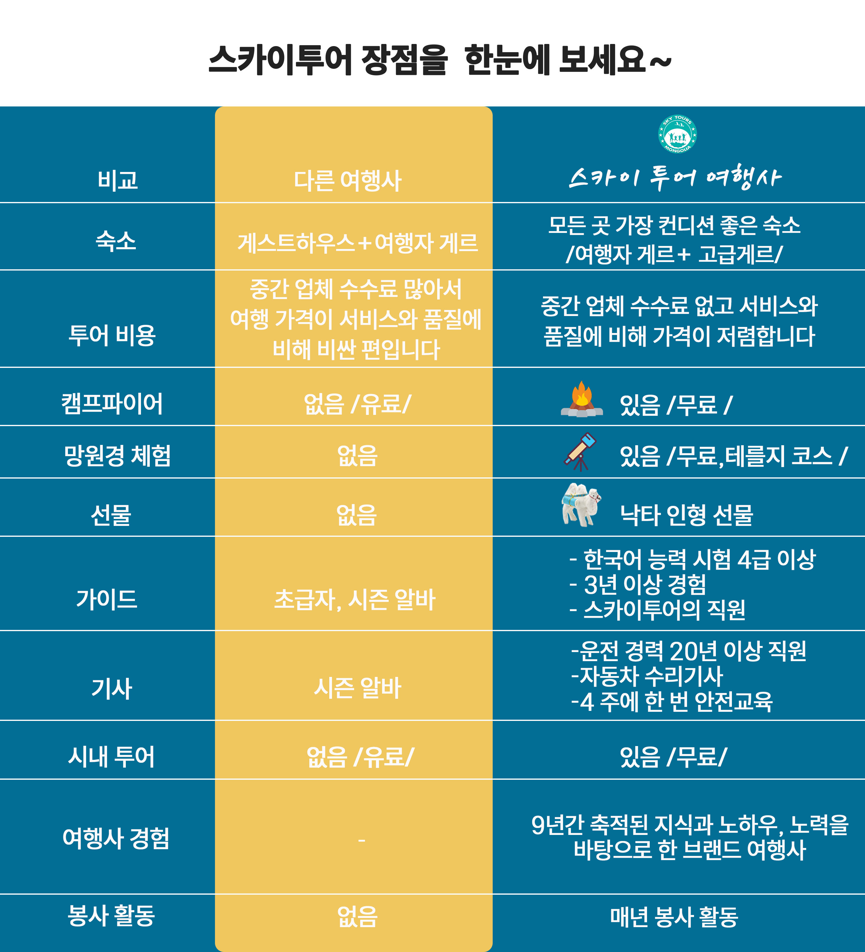 ◆ 여행자 보험 개인적으로 여행자 보험 받으시고 오셔야 합니다. ◆수화물 항공 수화물 부치는 짐은 1인 1개 캐리어 23kg입니다. ◆두꺼운 외투, 긴 바지 몽골은 여름밤에도 최저 5~6도까지 떨어지니 야간에는 두꺼운 외투 (11월 밤 날씨)가 필수입니다. 승마 시, 낙타 트레킹 시 기타 등등 긴바지는 필수입니다. ◆모자 고도가 높아 하늘과 가까운 몽골에서는 해를 충분히 가릴 수 있는 모자가 필수입니다. ◆침낭 유목민 게르에서는 침낭이 필수입니다. ◆선글라스 자외선이 강한 나라입니다. 선글라스 착용으로 눈을 보호해 주세요 ◆장갑 승마 시 손의 보호를 위해 착용하셔야 합니다. ◆신발 초원에서는 등산화 또는 운동화가 적절하며, 게르 캠프 내에서는 슬리퍼가 유용합니다. ◆수영복 쳉헤르 온천 지역으로 여행하시는 분들은 온천 이용 시 반드시 수영복(실내수영장 수영복)을 준비하셔야 합니다. / 래시가드 착용 불가입니다. ◆개인 세면도구 여행하는 동안 개인이 쓸 세면도구인 칫솔, 치약, 비누 등을 꼭 챙기셔야 합니다. 수건이 제공되는 게르 캠프도 있지만, 여분의 수건을 챙겨 오시는 것이 좋습니다. 유목민 게르에는 수건이 제공되지 않습니다. 드라이기는 제공되지 않습니다. ◆음식 몽골에서도 김치, 컵라면 등 한국 음식을 구입하실 수 있습니다. 다만, 고기 위주의 몽골 식사 시 입에 맞지 않을 것 같은 여행자께서는 밑반찬류를 준비하시는 것도 좋습니다. ◆환전 오만 원 권 혹은 100불 등 큰 단위로 준비하시면 환율이 좋습니다. 환전은 도착 시 몽골 현지 공항에서 가이드가 도와 드립니다. ◆여권은 필수입니다~ 잊어버리지 말 꼭 챙겨오세요~ (만약을 대비해서 분실 시 이용될 사진 2장을 지참해 주세요~) ※ 몽골 여행 무비자 안내입니다.
