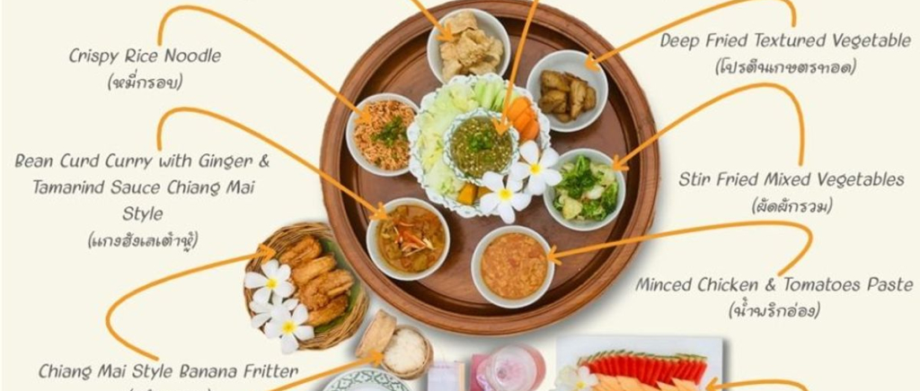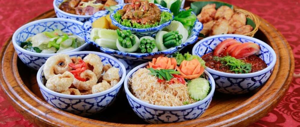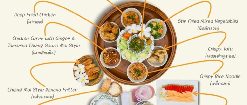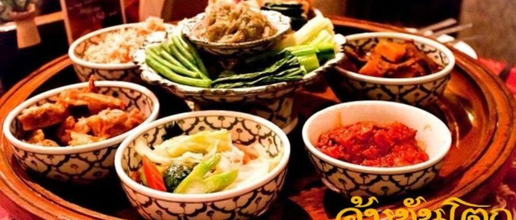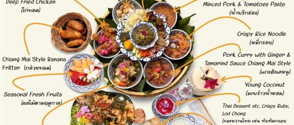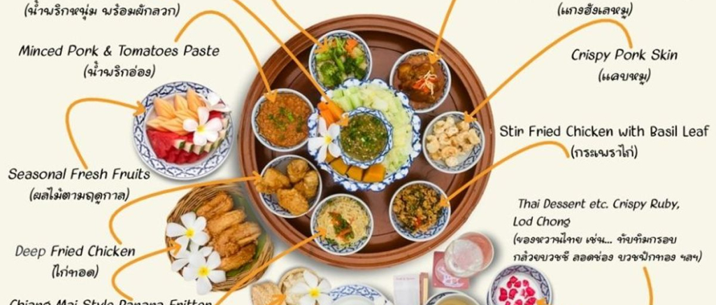 태국 전통 식사 방법인 바닥에 앉아 낮은 테이블에서 먹는 방식으로 큰 접시에 담겨 나오는 풍성한 가정식이며,