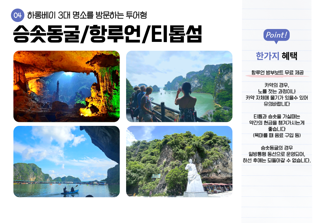 • 액티비티형 : 하롱베이 3대 명소 방문 ( 티톱섬, 항루언, 승솟동굴 )