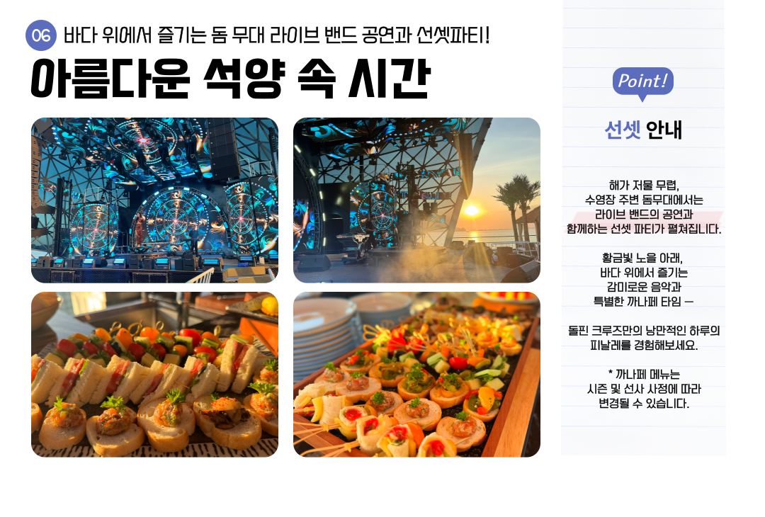 • 상세 설명의 일정으로 이루어지나 당일 크루즈 상황에 따라 소폭 변경될 수 있습니다.