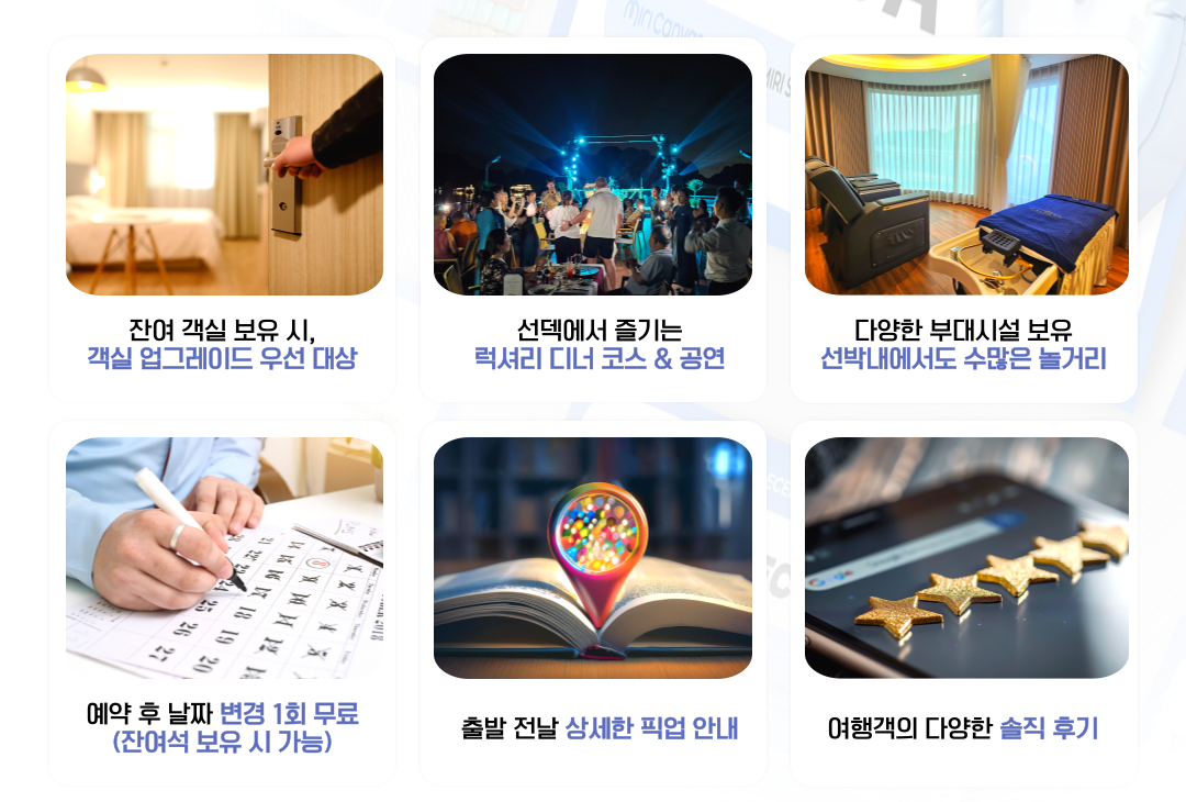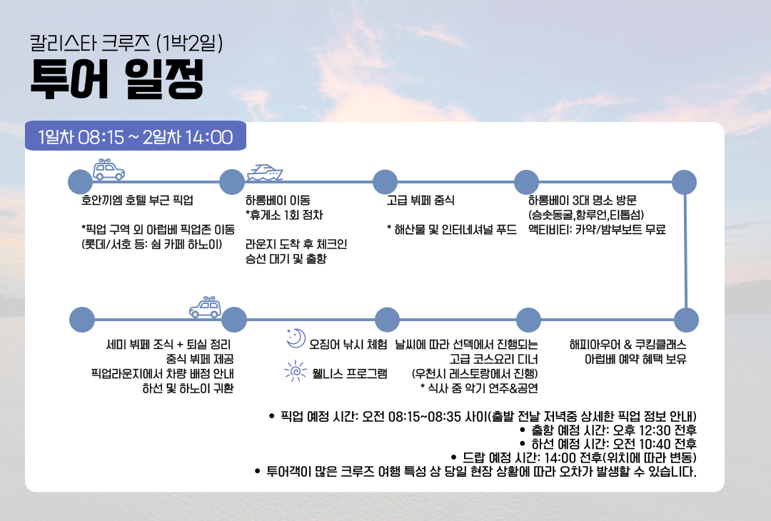 • 상세 설명의 일정으로 이루어지나 당일 크루즈 상황에 따라 소폭 변경될 수 있습니다.
