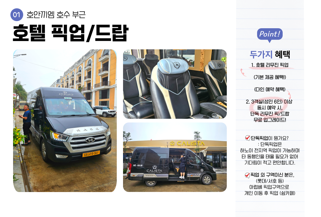 • 롯데, 인터컨, 서호, 호안끼엠 호수 부근에서 픽업 가능합니다, 단 시내에서 거리가 먼 호텔은 픽업이 불가능 해