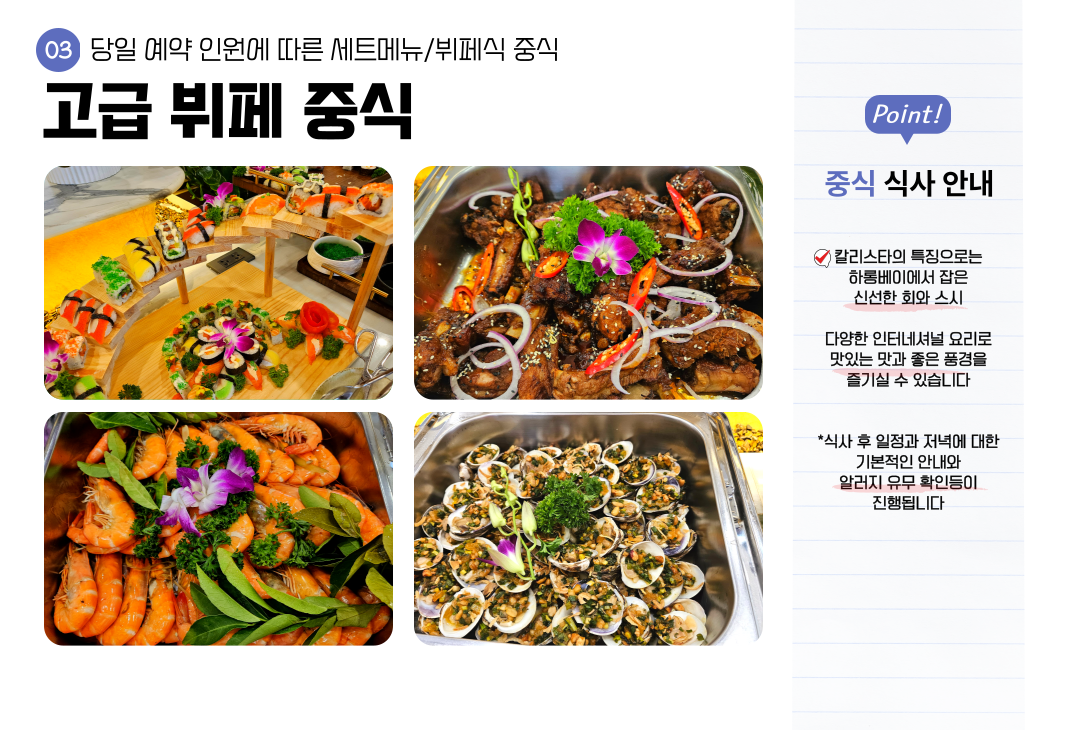 • 🍴 식사제공 : 풀보드 식사 제공 ( 총 4끼 - 중식 / 석식 / 조식 / 브런치 )