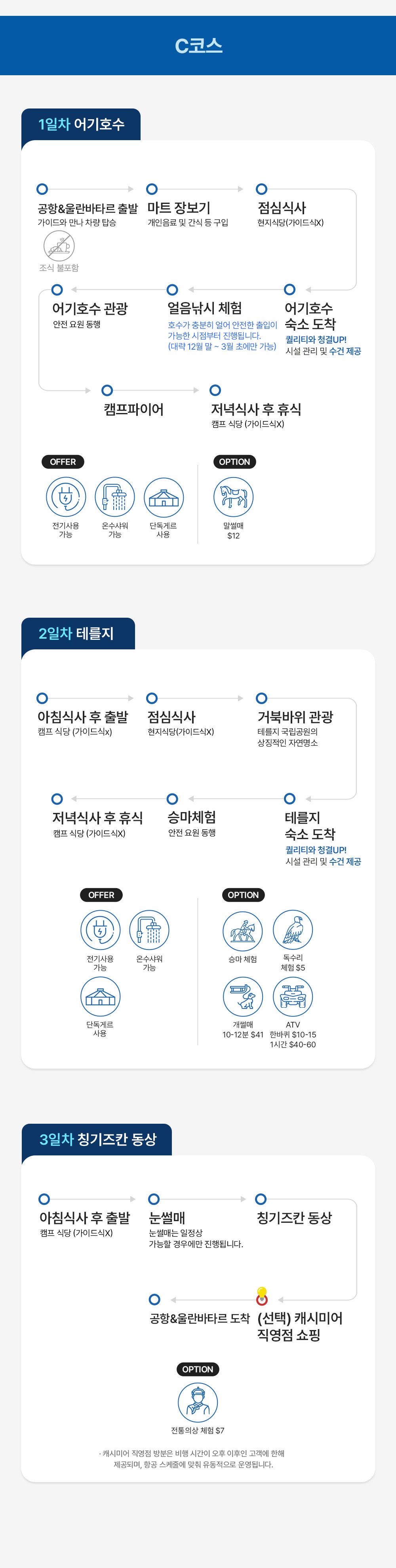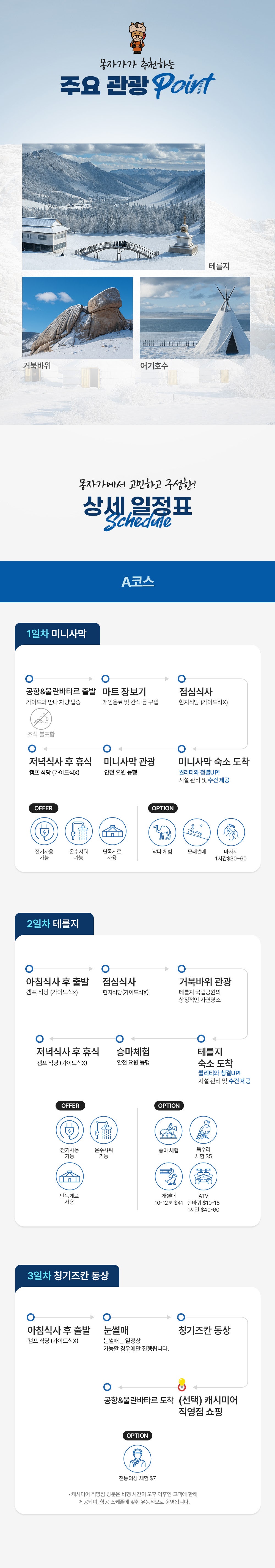 온천,은하수,모래썰매,낙타,보트탑승,승마,독수리,칭기즈칸동상,쇼핑