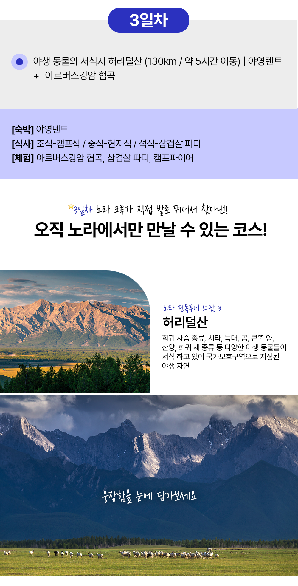 • [3day] 몽골의 숨은 보석, 국가 보호구역 허리덜 산맥아르버스깅암 협곡을 걷습니다. 밤엔 별빛 아래 삼겹살 파티캠프파이어. 오늘은 자연 속 텐트 숙박이에요!