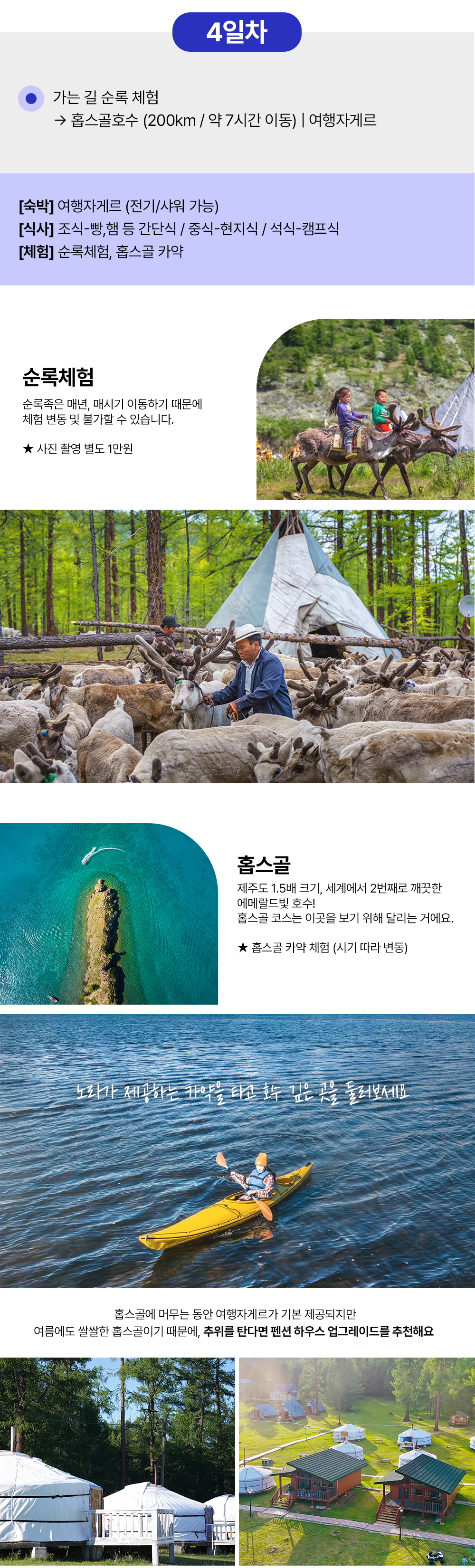 • [4day] 드디어 도착한 홉스골 호수. 카약 타기순록 체험으로 몽골 북부의 전통을 경험하고 여행자 게르에서 따뜻한 하룻밤을 보냅니다.