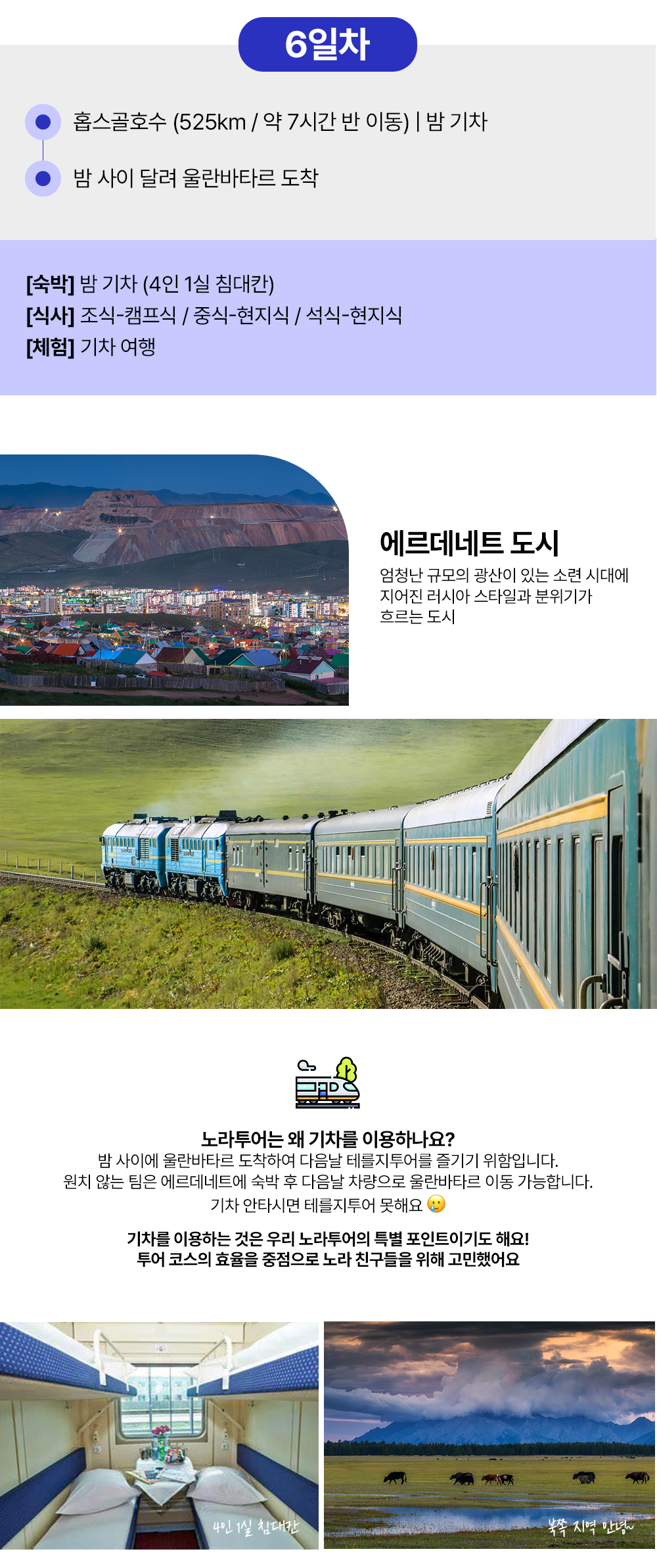 • [6day] 몽골 제3의 도시 에르데네트에 들러 현지 분위기를 느낀 뒤 밤기차 침대칸을 타고 낭만적인 야행을 떠납니다.