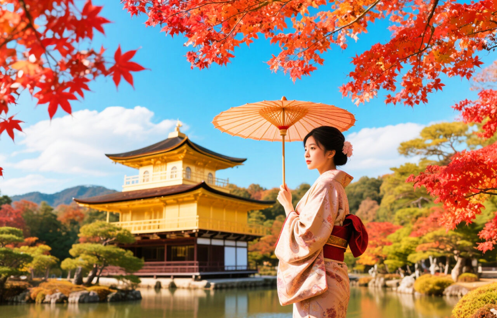 교토 대표 사찰 금각사에서 황금 누각과 연못 풍경을 감상해 보세요.