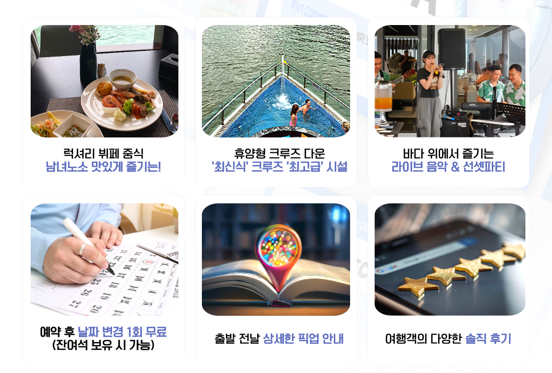 | 크루즈 일정 도중 취소 시 | 제공된 서비스(차량, 중식, 입장료) 공제 후 환불 |