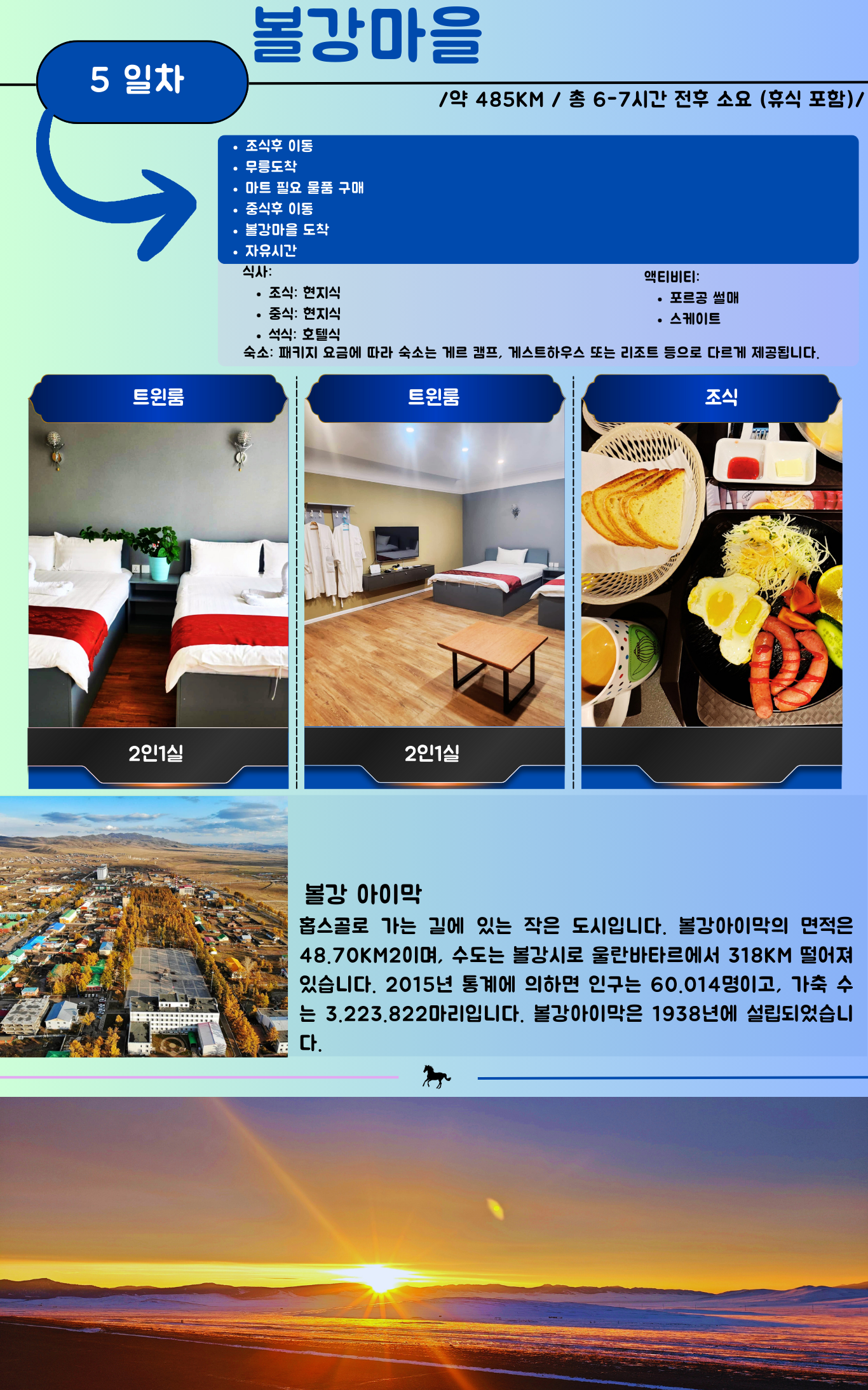 석식 이후 가이드는 퇴근합니다. 캠프 내 과도한 음주 및 소음으로 타 여행객에게 불편을 주지 않도록 매너를 지켜주세요.