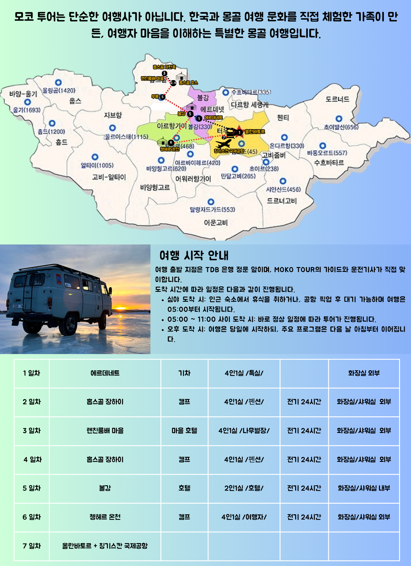 예기치 못한 차량 고장 시 즉시 대체 차량을 지원해드리며, 몽골의 장거리 특성상 도착에 시간이 소요될 수 있습니다. 이로 인한 일정 지연 및 일정 소화 불가에 대한 환불은 어렵습니다.