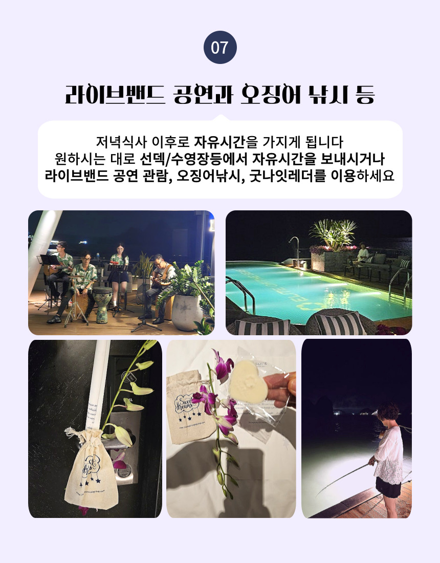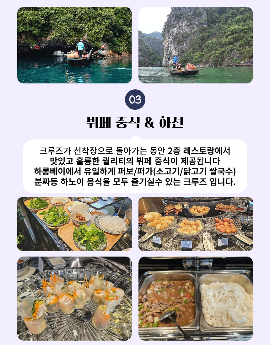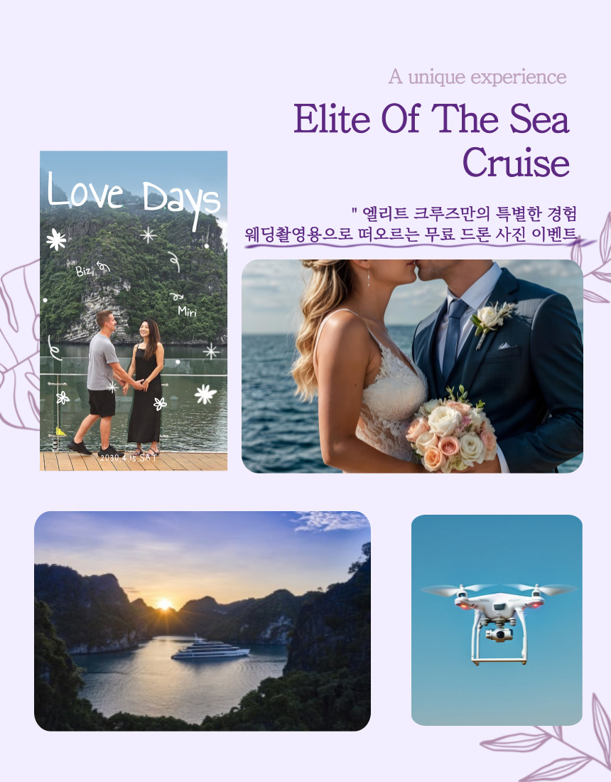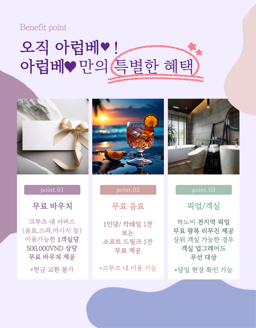 • 크루즈 내 서비스 (음료,스파,마사지 등)을 이용할 수 있는 1객실/500,000VND 상당의 무료 바우처 제공