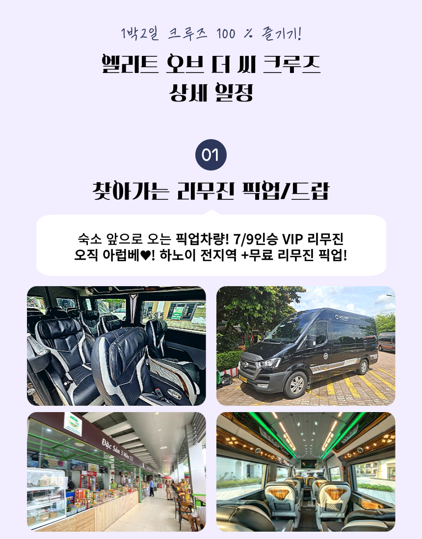 - 픽업 시간 : 호안끼엠 호수 인근 구역 여행자 거리 각 호텔로 리무진 방문 픽업(08:15~08:45AM)