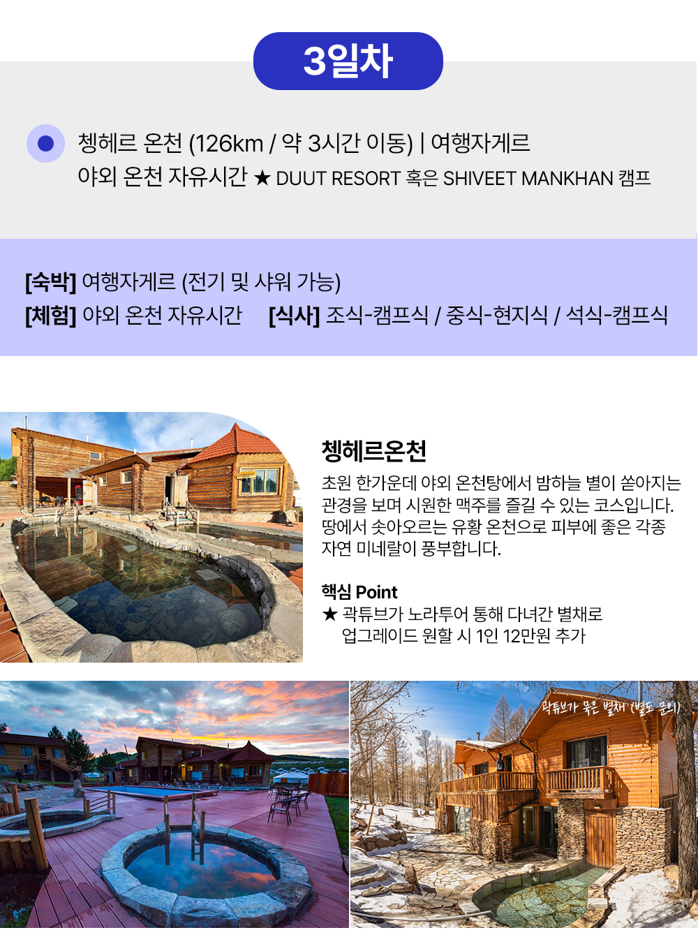 [체험] 야외 온천 [식사] 조:캠프식 중:현지식 석:캠프식 [숙박] 여행자게르 (전기 가능&화장실 샤워실 외부 공용) 쳉헤르온천: 초원 한가운데 야외 온천탕에서 밤하늘 별이 쏟아지는 관경을 보며 시원한 맥주를 즐길 수 있는코스입니다. 땅에서 솟아오르는 유황 온천으로 피부에 좋은 각종자연 미네랄이 풍부합니다. ★ DUUT RESORT 혹은 ★ SHIVEET MANKHAN 이용 ★여행자게르-일반 숙박 ★단독탕 있는 별채로 업그레이드 시 별도 문의(인원별 가격 상이) (샤워실 화장실 내부)