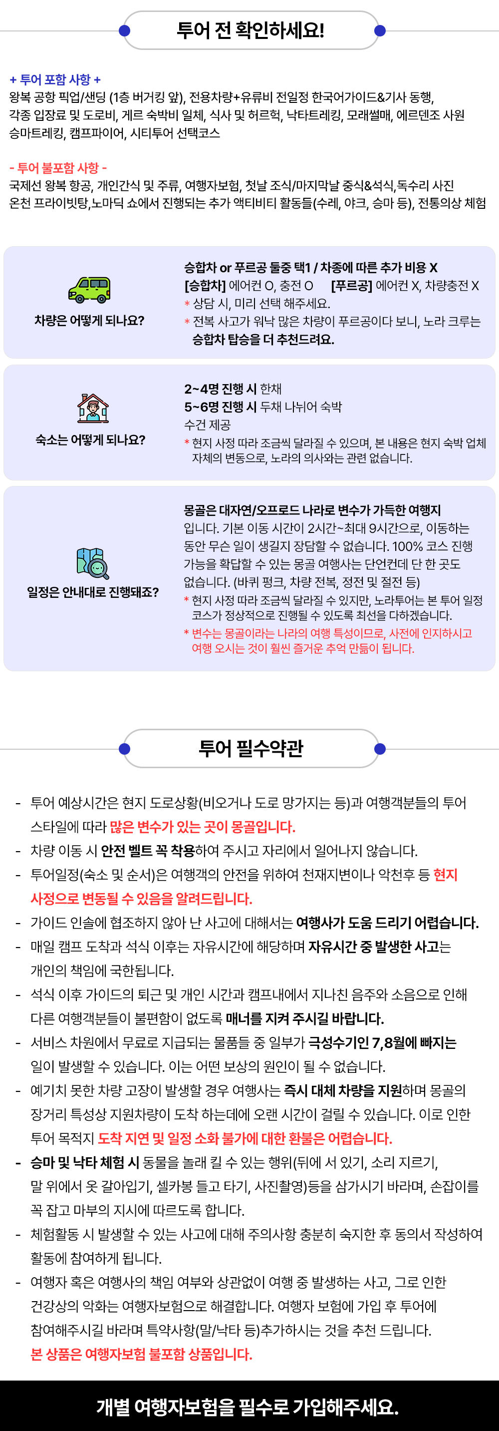 • 여행자 또는 여행사 책임 여부와 무관하게 여행 중 발생 가능한 사고·질병 등은 여행자보험으로 해결합니다. 투어 전 여행자보험 필수 가입을 권장하며, (말/낙타/ATV/말썰매/개썰매/얼음·눈썰매 등) 액티비티 특약 가입을 추천드립니다. 본 상품은 여행자보험 불포함 상품입니다.