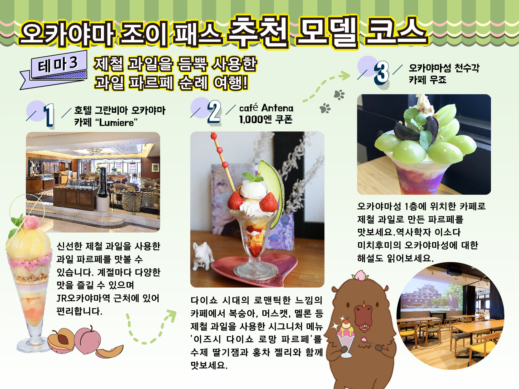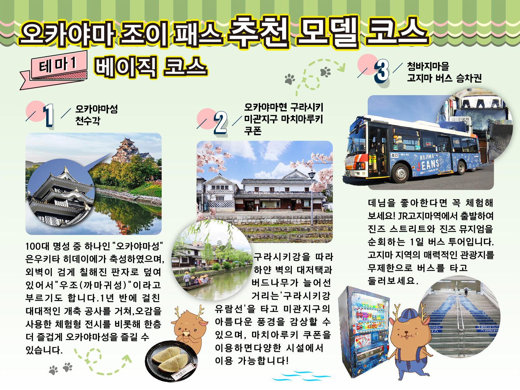 간사이 국제공항으로 입국하여, 오사카에서 오카야마로 이동시에는 JR간사이 와이드패스를 구매하여 이용하시면 추가요금없이 신칸센을 타고 오사카-오카야마를 왕복할 수 있습니다. (신오사카역~오카야마역 신칸센으로 약45분) 1번 왕복만으로 본전뽑기 가능!! 공항에서 오사카 시내로 이동할 때도 추가요금 없이 하루카 승차도 가능해서 “오카야마 조이패스”와 함께 구매하면 좋아요