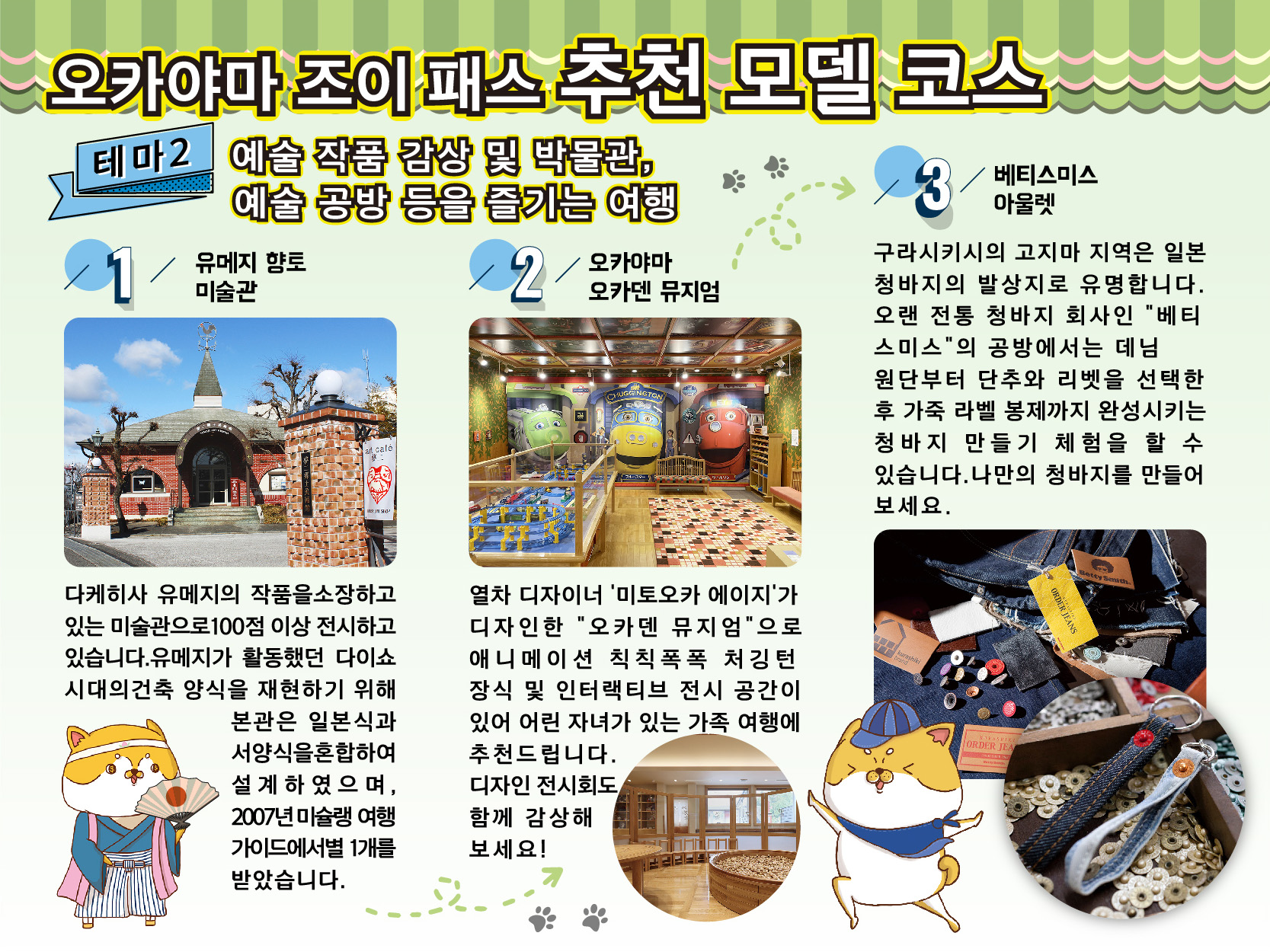 • ※ 8월 7일부터 이용가능한 시설이 추가 됩니다. 1. 에키 렌터카 2000엔 쿠폰 (당일에 한하여 이용 가능하며, 예약 불가합니다.) 2.「숲의 예술제 맑은 나라·오카야마」 아트 패스포트 (2024/9/28~11/24)