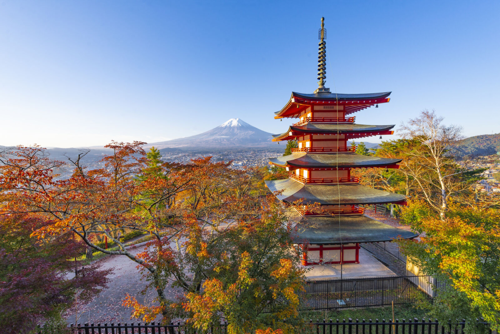 오층탑과 함께 펼쳐지는 후지산의 대표적인 전망을 감상합니다.