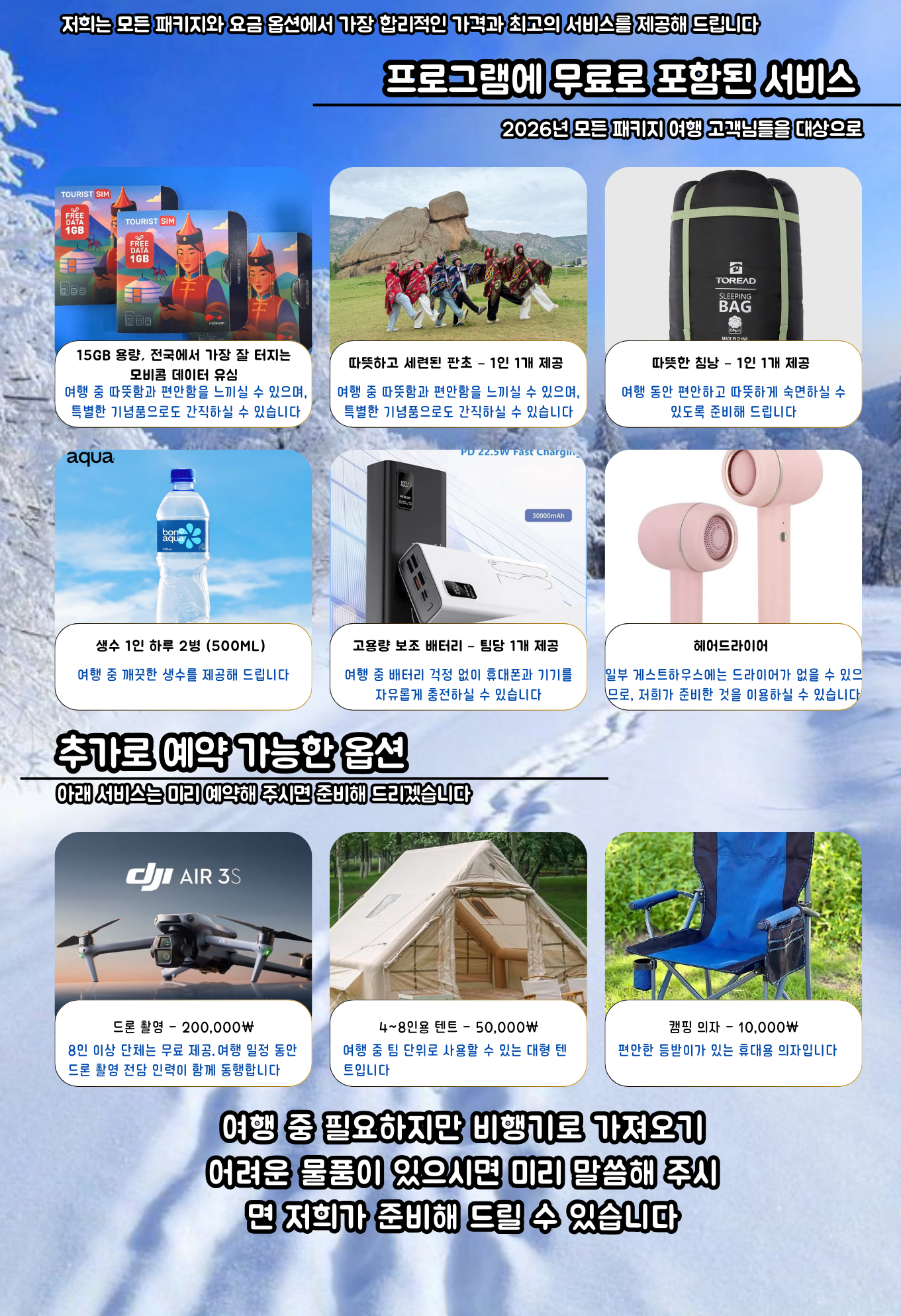여행 중 발생하는 건강 악화나 사고는 여행자보험으로 해결하며, 여행자보험 가입 후 투어 참여를 권장합니다. 특히 말·낙타 체험 보상 특약 추가를 추천드립니다. (본 상품은 여행자보험 불포함)