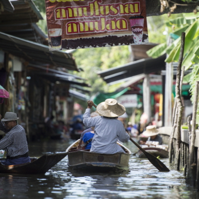 방콕 근교 로컬 핫플레이스인 담넌사두억 수상시장과 위험한 기찻길 시장을 관광하는 투어에요. 첫번째로 들리는 곳은 담넌사두억 수상시장이랍니다. 롱테일 보트를 타고 좁은 운하를 지나며 물위에 지어진 여러 기념품샵과 음식점을 구경합니다. 담넌사두억 수상시장은 관광객 위주로 물건을 판매하고 있다보니 흥정은 필수에요! 두번째로 아슬아슬하게 시장길로 들어오는 기차를 보러 떠납니다. 기차 시간에 맞춰 상인들이 분주히 천막과 매대를 정리하는 진풍경이 펼쳐져요. 전문 택시 기사님과 함께 우리 일행끼리 프라이빗하게 진행됩니다.
