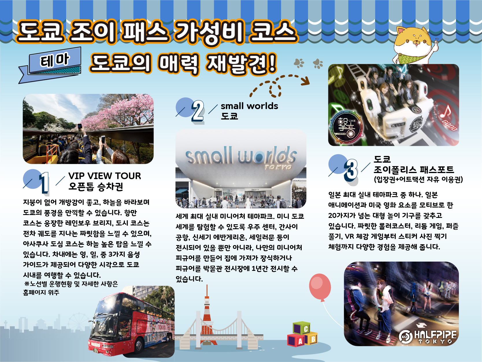 도쿄의 주요 관광시설을 1주일동안 3곳을 가성비있게 여행할 수 있는 “도쿄 조이 패스”. 9,000엔으로 일주일동안 3개시설을 이용할 수 있으며, 한 개의 QR코드를 모바일에 저장해서 보관도 편리합니다. 영상보러가기
