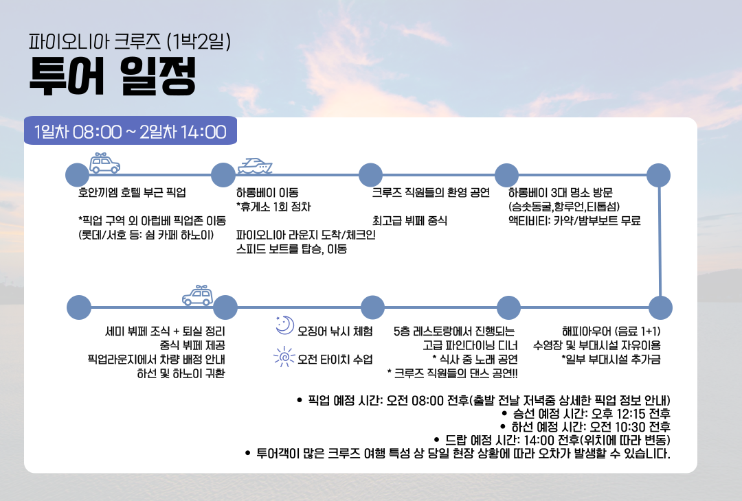 • 상세 설명의 일정으로 이루어지나 당일 크루즈 상황에 따라 소폭 변경될 수 있습니다.
