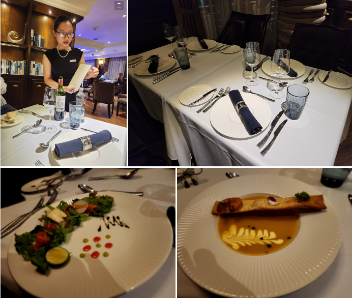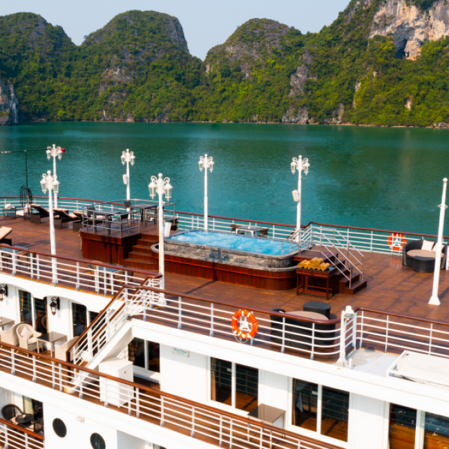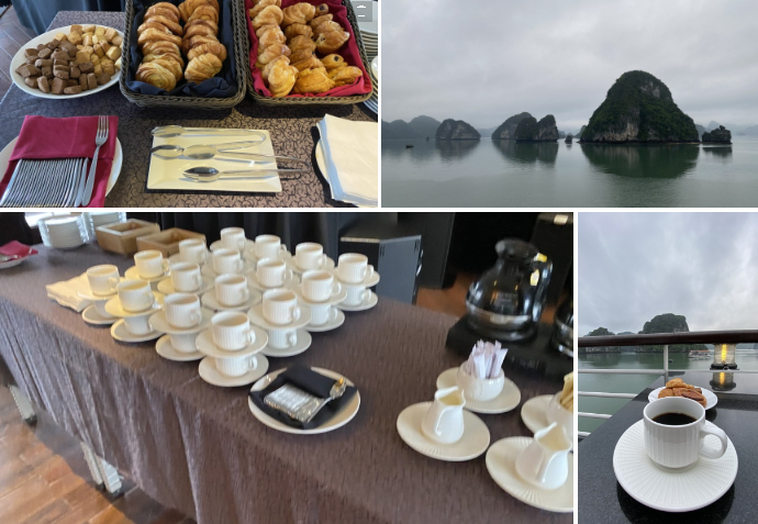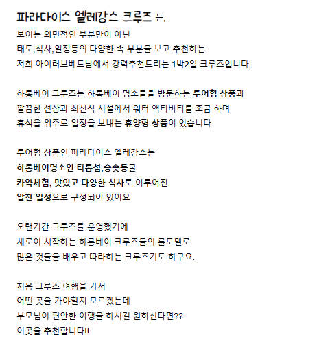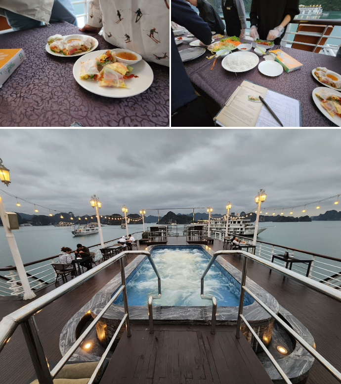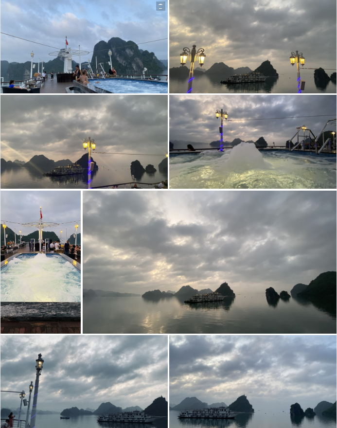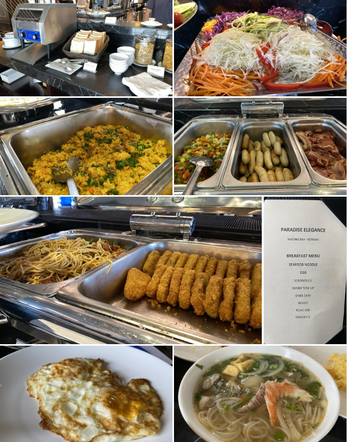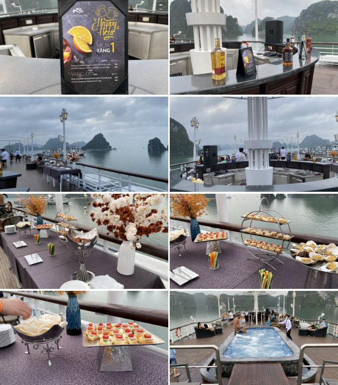 약 3분 정도 이동하여, 파라다이스 엘레강스 보트에 탑승 합니다.보트 이곳 저곳을 둘러 보시고, 객실을 찾아들어가시면 됩니다 케리어는 직원들이 방 입구까지 가져다 드립니다.(아래 사진들을 클릭하면 커집니다.)1층의 딜럭스룸과 2층의 프리미엄룸은 위치만 다르고 면적이나 구조, 시설은 같습니다.2층의 선수쪽의 캡틴 스윗과 2층 선미쪽의 엘레강스 스윗은 '스윗'객실로 각각 조금씩 더 넓은 발코니와 욕조가 있습니다.4층 Sun Deck에 작은 자꾸지를 설치한것이 이번 코로나 기간동안 달라진 점입니다.이날은 날씨가 좀 흐렸으나 평소에는 예쁜 장관을 자아냅니다 !🍱 뷔페식 중식점심은 뷔페식으로 제공됩니다.초밥과 해산물, 새우, 튀김, 샐러드, 빵, 과일&디저트등 다양하게 제공됩니다.하롱베이 크루즈에서 이정도 퀄리티는 중식 메뉴를 뽑아내는곳은 많지 않습니다.역시 하롱베이 최고의 크루즈 답게 숫자만 많고 실제로는 손이 가지 않는 타 저등급 크루즈와는상반된 차이점을 보여줍니다. 음식은 하나하나 입에 잘 맞았습니다.🚣 진주양식장&카약점심 식사 후, 잠시 휴식을 가진뒤, 진주양식장에 갑니다.이곳에서, 수상마을 사람들이 어떻게 진주를 양식하는지 볼 수 있고, 하롱베이의 진주들을 비싸지 않은가격에 구입할 수도 있습니다.그리고, 카약을 탈 수 있습니다.카약은 2인 1조로 타시고, 현장에서 1대 36만동(또는 $20 정도) 비용이 별도로 발생합니다.(크루즈 하선시 결제)하지만, 저희 아이러브베트남을 통해서 예약하시는 모든 분들에게는 별도 비용없이 카약이 무료 제공됩니다.아이들도 탈 수 있습니다.카약킹을 할때는, 노에서 물이 튀어 옷, 신발이 젖을 수 있습니다.카약 체험 후 다시 모선으로 돌아 옵니다.🌄 티톱섬보트에서 잠시 휴식을 가진 뒤 이번에는 티톱섬으로 갑니다.티톱섬에서 두가지를 선택하실 수 있는데,1. 777개의 계단 높이의 전망대에 올라가 하롱베이 전경을 둘러보기2. 해변에서 수영을 하고 놀거나, 비치의자에서 쉬는 사람 구경하기* 비치의자는 1인 3만동(약 1,500원)의 비용을 현금으로 내야 합니다.티톱섬에서는 약 1시간 정도의 시간을 가집니다.저는 운동 부족형 저질 체력이라, 비치의자에서 캔커피 사마시며 비키니 입은 사람들을 구경하며 시간을 보냈습니다.🍷 선셋파티Sunset Party다시 보트로 돌아오면, 1+1음료 행사와, 쿠킹 클래스가 진행 됩니다.칵테일이나 맥주등을 주문 하시면, 1개 주문시 1개가 무료로 제공됩니다.메뉴는 베트남 전통 음식인 스프링 롤을 만들어보고 시식해보는 시간을 가집니다.🥩 저녁 만찬저녁식사는 세트메뉴로 제공됩니다.샐러드 - 스프&빵 - 메인메뉴1(생선 스테이크) - 메인메뉴2(소고기 스테이크) - 디저트(케잌&아이스크림)순으로 제공되며 둘중에 메인메뉴는 둘중 하나만 고르셔도, 둘다 고르셔도 됩니다.베트남 하롱베이 최고 크루즈의 석식 메뉴답게 식기들이 퀄리티가 높고 음식도 입에 잘 맞습니다.단, 스프의 경우 비스크 스톡을 베이스로한 해산물 스프로, 양식을 많이 접해보지 못한 분들에겐 갑각류의감칠맛이 비린내 라고 느껴지실수 도 있습니다.(식사 메뉴는 더 나은 서비스를 제공하기 위해 예고없이 변경될 수 있습니다.)저녁식사 이후에는, 삼삼오오 모여 담소를 나누거나, 객실에서 쉬시거나, 오징어 낚시를 체험해 보실 수 있습니다.2일차 Coffee & Bread다음날 아침 7시. 간단한 커피 & 티와 빵이 제공됩니다.6시 30분, 태극권 배우기는 참여율이 낮을 경우에는 진행되지 않습니다.🦇 승솟 동굴 방문간단한 식사를 한 후, 하롱베이에서 가장 큰 동굴인 승솟동굴로 갑니다. 어메이징 케이브(Amazing cave)라고도 불려지는 승솟동굴은 완만한 계단을 타고 올라갔다가 동굴 내부를 둘러보고 다른 경로로 내려옵니다.티톱의 절반 정도 높이라 어렵지 않게 오를 수 있습니다.이곳에서 보는 전망도 아주 좋습니다.🍱 브런치 뷔페보트로 돌아와 샤워를 하고, 마지막 식사를 즐깁니다. 브런치는 아침 9시경에 준비됩니다.해물쌀국수, 계란요리 등은 직원에게 주문 하실 수 있습니다.(무료)(역시 메뉴는 현장 상황에 따라 약간의 차이가 있을수 있습니다.)💙 여기서 예약시 혜택 !! + 항구로 복귀브런치를 즐기시는 동안, 보트는 다시 항구로 돌아옵니다.오전 10시경 보트에서 하선을 하고, 전기차를 타고 체크인 했던 호텔로 돌아가며 여정이 끝을 맺습니다.당사를 통해 파라다이스 엘레강스 크루즈와 VIP 리무진픽업을 동시에 예약하신 경우,파라다이스 스윗 호텔에서 뷔페 런치 또는 간단한 점심 도시락을 추가로 제공해 드립니다.(단, 왕복 리무진 포함된 예약시)11시경 부터, 준비된 점심을 드신 후, 크루즈 직원들의 안내에 따라 리턴 리무진을 타시면 투어 일정이 종료 됩니다.리턴 리무진은 정오에 출발하며, 하노이 도착 예정 시간은 약 오후 2시 30분 정도 입니다.