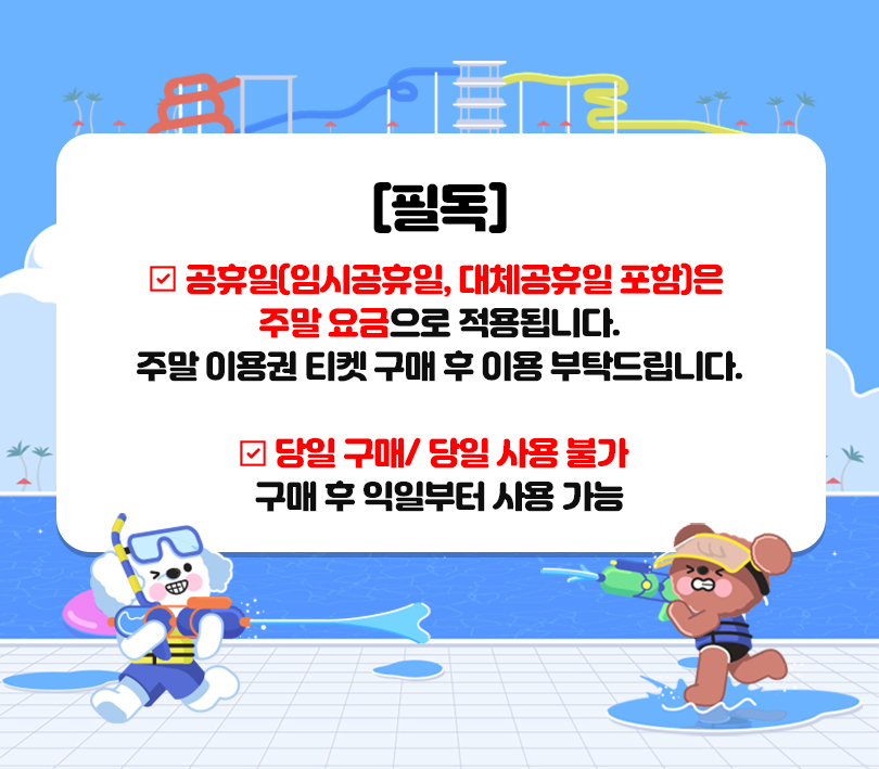 ※ 슬라이더 이용 시 청바지, 날카로운 금속 장식 수영복, 일반 복장 착용은 금지됩니다.