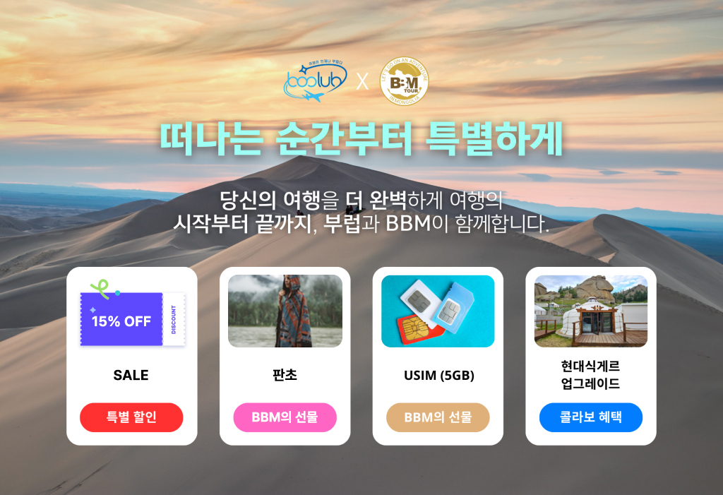 안녕하세요, BBM투어입니다. 저희는 2009년도에 설립하여 15년의 경험과 노하우를 바탕으로 안전하고 편안한 여행을 위해 최선의 서비스를 제공하고 있는 전문 여행사입니다. 몽골의 아름다운 자연, 유목민들의 생활과 문화를 체험하러 오시는 방문자 여러분! 저희 BBM투어는 여러분을 기다리고 있으며 여행 동반자로서 아름다운 추억의 시작과 끝을 함께하고, 안전하며 만족스러운 여행으로 보답하겠습니다. 파트너 상품보기