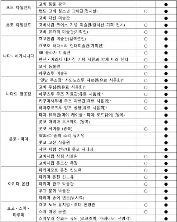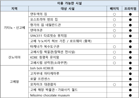 1. 예약 후 메일에 1장의 PDF 파일을 수령하여, 지정 이용일에 시설에 방문하여 QR코드를 제시해 주세요. 2. 각 이용시설마다 매번 QR코드를 제시할 필요가 있습니다. 이용 기간 중에 QR코드를 분실하지 않도록 주의해 주세요. 3. 해당 패스포트는 첫 시설 이용 개시일에만 유효합니다. ※2일권 사용 시 시작일과 다음날 연속일로만 사용 가능합니다. 4. 동일 시설 이용은 1회에 한합니다. 5. 유효기간은 구매일부터 2025년 5월 31일까지입니다. 6. 각 시설의 주의사항, 영업시간, 휴관일 등은 사전에 각 시설 공식 홈페이지에서 확인해 주세요. 7. 이 상품은 구입 후 취소 및 변경 환불이 불가합니다. 8. 모자이크 관람차를 이용하시는 경우, 6세 이하의 어린이는 보호자의 동반이 필요합니다. 9. 롯코 케이블은 “롯코 케이블 시타역-롯코 케이블 산죠역” 구간을 왕복으로 이용 가능합니다. .프리미엄 1일권, 2일권 1. 롯코 아리마 로프웨이는 “롯코 산쵸역-아리마 온천역” 구간을 왕복으로 이용 가능합니다. 2. 마야 뷰 라인은 “호시노역-마야 케이블역” 구간을 왕복으로 이용 가능합니다. 3. 고베 누노비키 허브 가든 / 로프웨이는 왕복이용권입니다. 이용 시, 반드시 허브 가든 산로쿠역에서 직원에게 티켓을 제시한 후 이용해 주시길 바랍니다. ■공식 홈페이지 ※각 시설의 주의사항, 영업시간, 휴관일 등은 사전에 각 시설 공식 홈페이지에서 확인해 주세요. https://www.feel-kobe.jp/smartpass/ ■각 시설 티켓 교환 장소 https://www.feel-kobe.jp/smartpass/