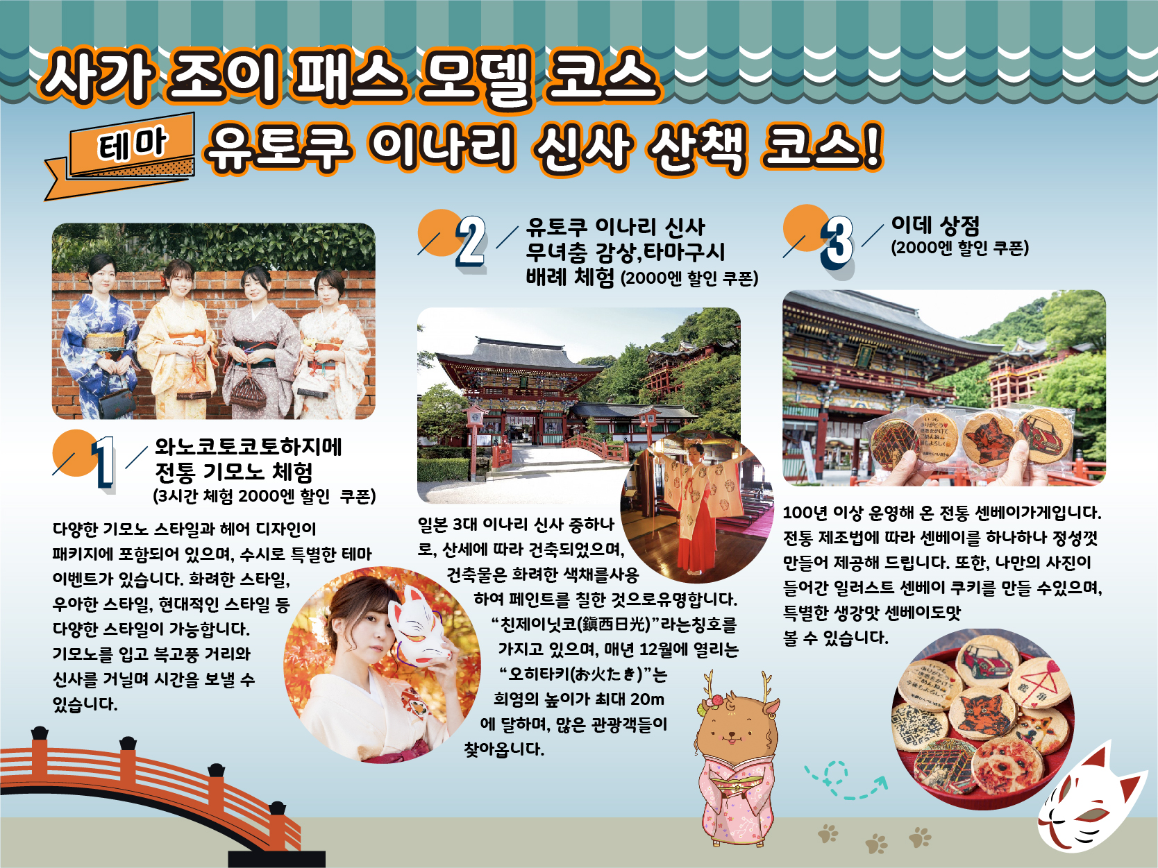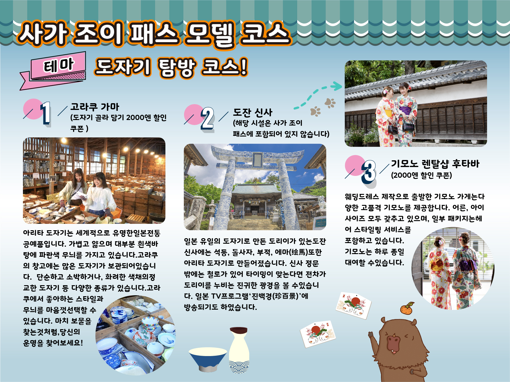 사가 지역의 매력적인 관광지와 인기 시설을 대상으로 한 가성비 티켓, 사가 조이 패스! 유효기간 내에 대상 시설 중에서 원하는 시설 3곳을 선택하여 할인 혜택을 받으실 수 있습니다. 바우처의 QR코드 1개만으로 모든 시설을 이용할 수 있어, 티켓 관리도 매우 간편합니다.