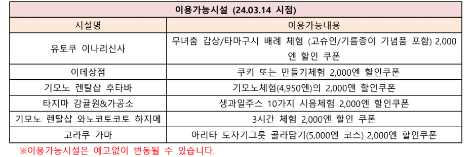 바우처의 유효기간은 구매일로부터 270일이며, 최초 이용개시일부터 7일간 사용 가능합니다. 원하는 시설에 방문하여 QR코드 제시 후 이용해 주세요. 각 시설의 주의사항 및 영업시간, 정기휴일 등에 대한 정보는 다음 링크에서 확인해 주세요. 홈페이지 바로가기